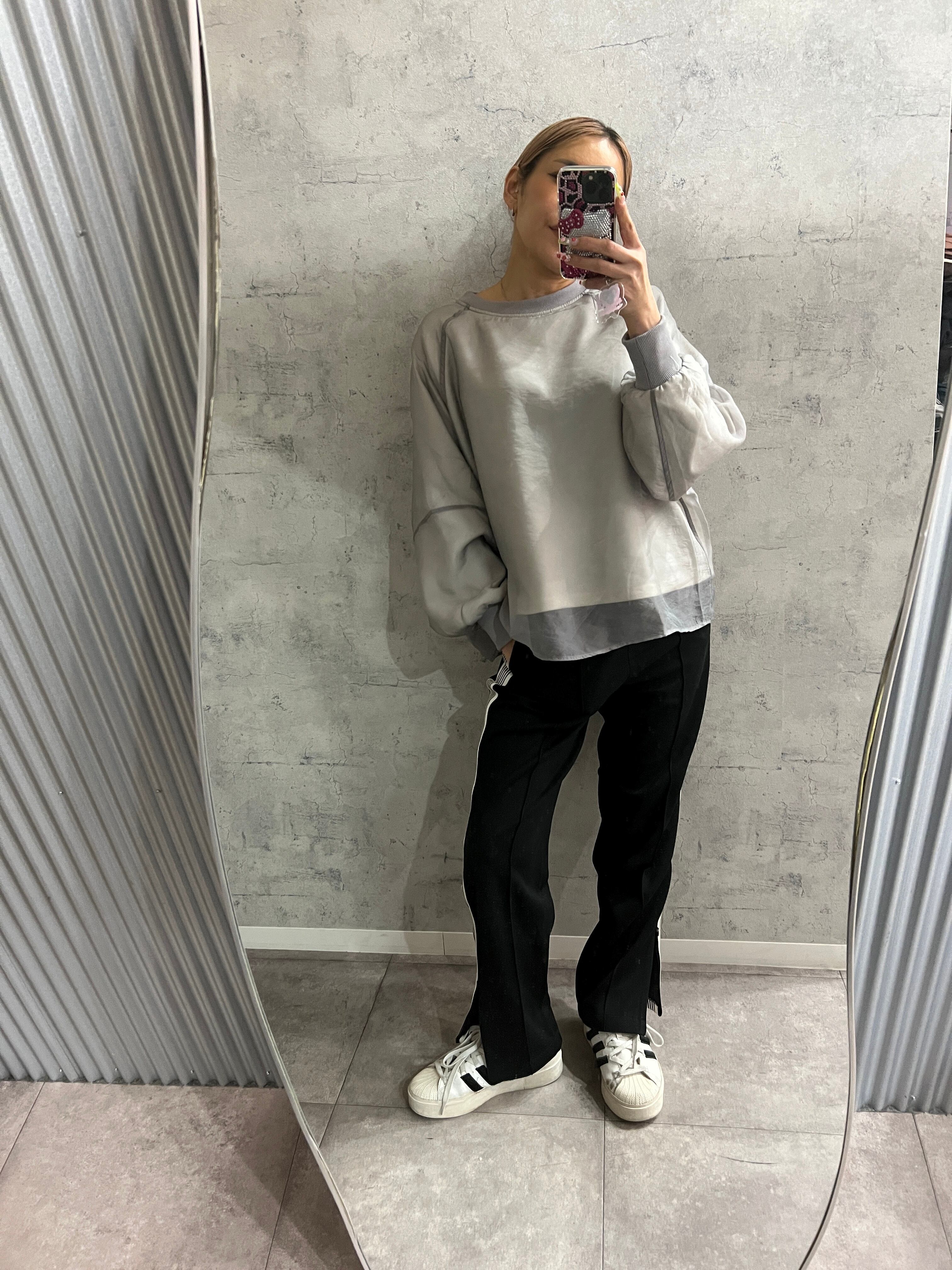 ボリュームがありながらもラグランスリーブで、肩回りはスッキリとした表情です。